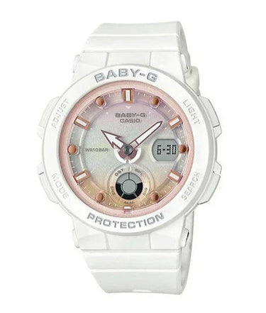 Bar-shaped hour markers round out the simple design of the face. Neon Illuminator uses black light, which causes face elements to glow for easy reading. Turning on illumination causes the hands to glow hues that create the illusion of the night-time ocean. These new BABY-G models are just the thing for a wide variety of summertime travel and beach activities.