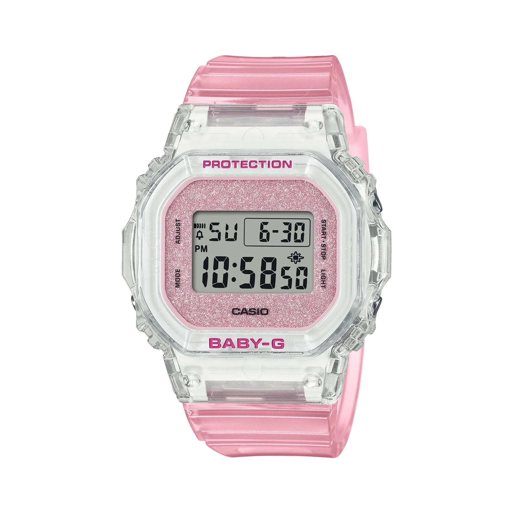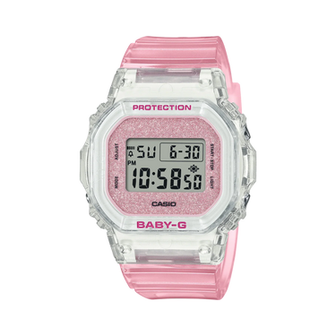 While maintaining the compact, angular style of the BGD-565, this BABY-G takes on see-through color with a bezel and band in translucent resin and glittering dial for an added touch of luxe flair.
