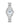 Stainless steel case and bracelet with a silver white dial featuring blue hands and markers. Domed mineral crystal.
