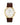 Gold tone stainless steel case and brown leather bracelet with three-piece buckle closure. White dial featuring roman numeral markers and date window.