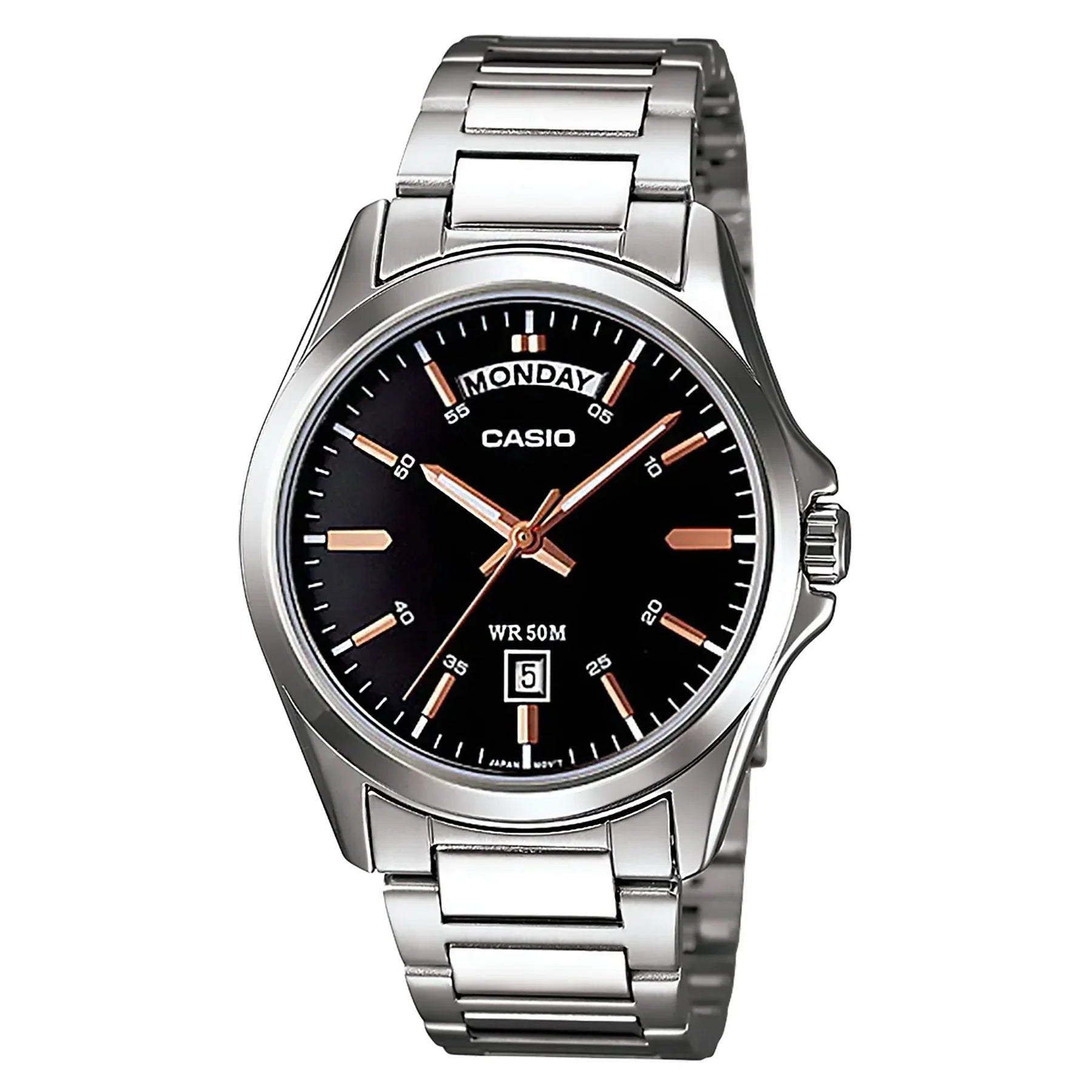 This watch features an ion-plated case and triple-fold clasp, along with a stainless steel band and mineral glass for durability. It also has 50-meter water resistance and displays the day of the week and date. With regular timekeeping, this watch is perfect for everyday wear.