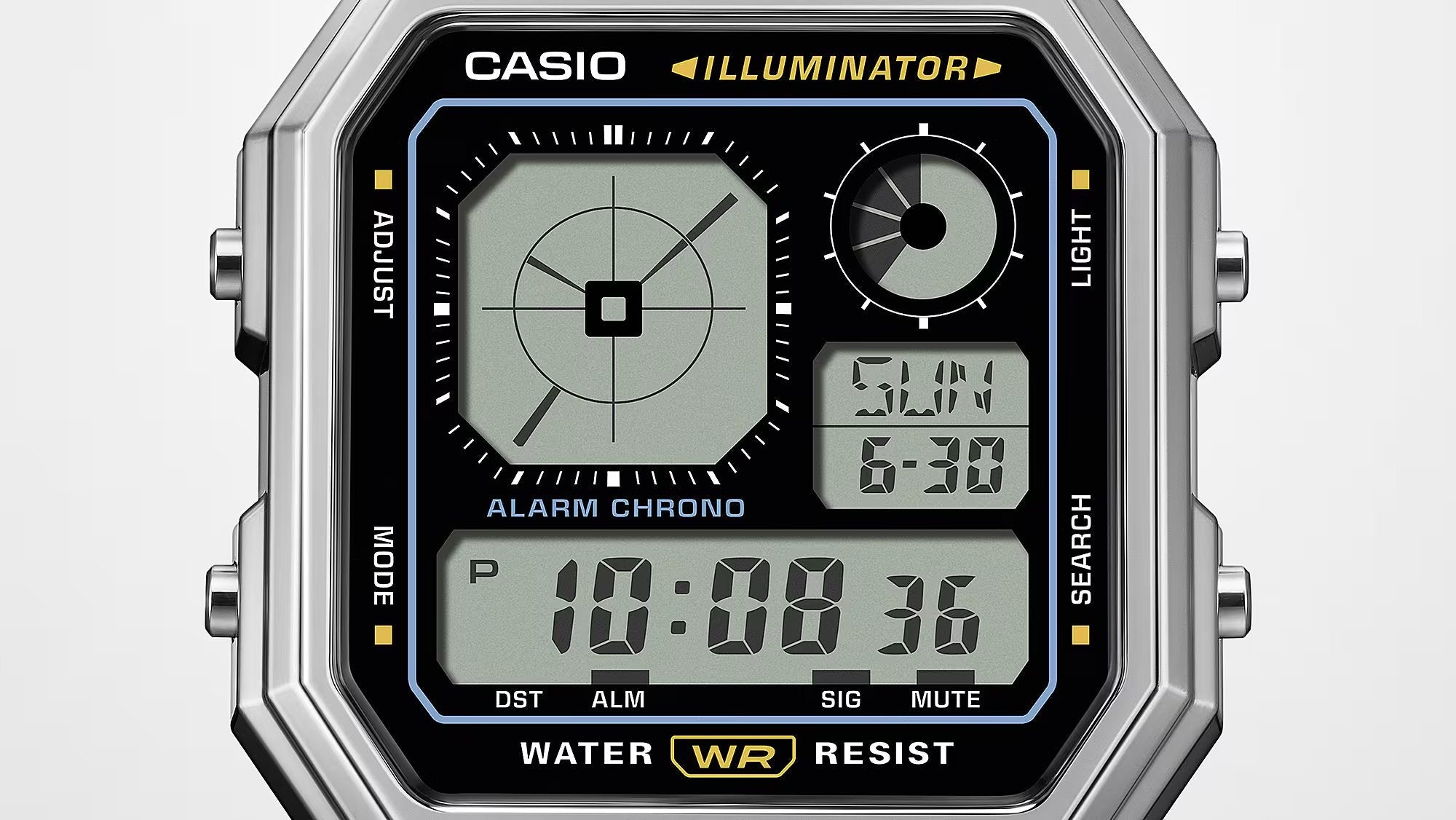 A digital watch featuring an analogue-style clock display all wrapped up in the gadgety look you love.