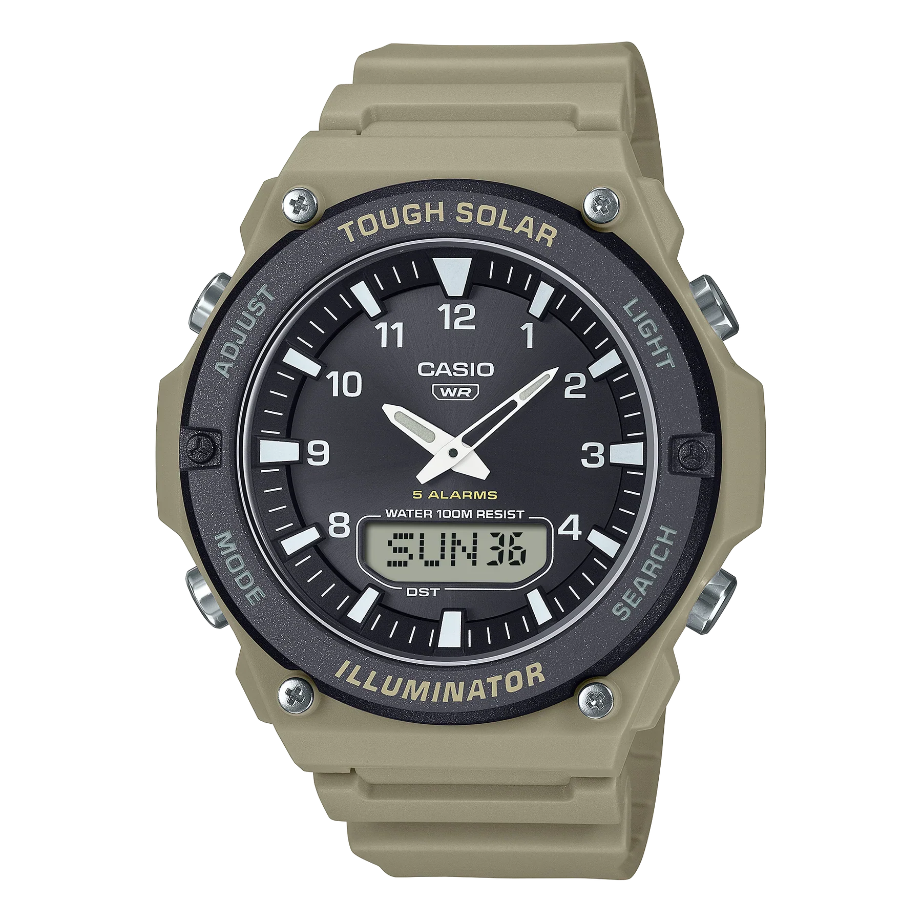 The round, flat bezel is paired with indexes and watch hands in white for easy-to-read visibility. The handy LCD at the 6 o’clock position displays the date, day, and world time.