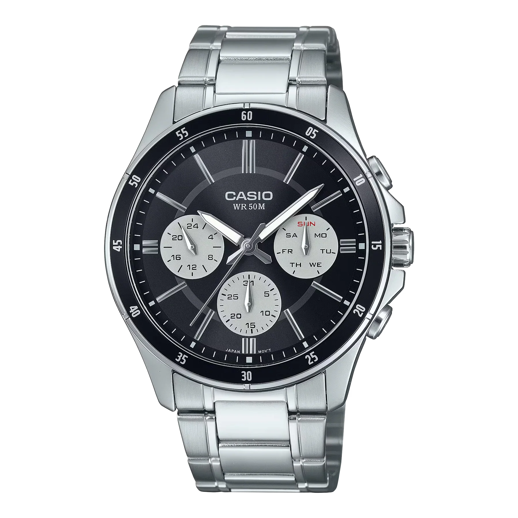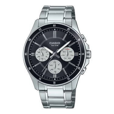 A metal analogue watch with a cool, sporty design. Water resistant up to 50 metres for peace of mind, even on rainy days.