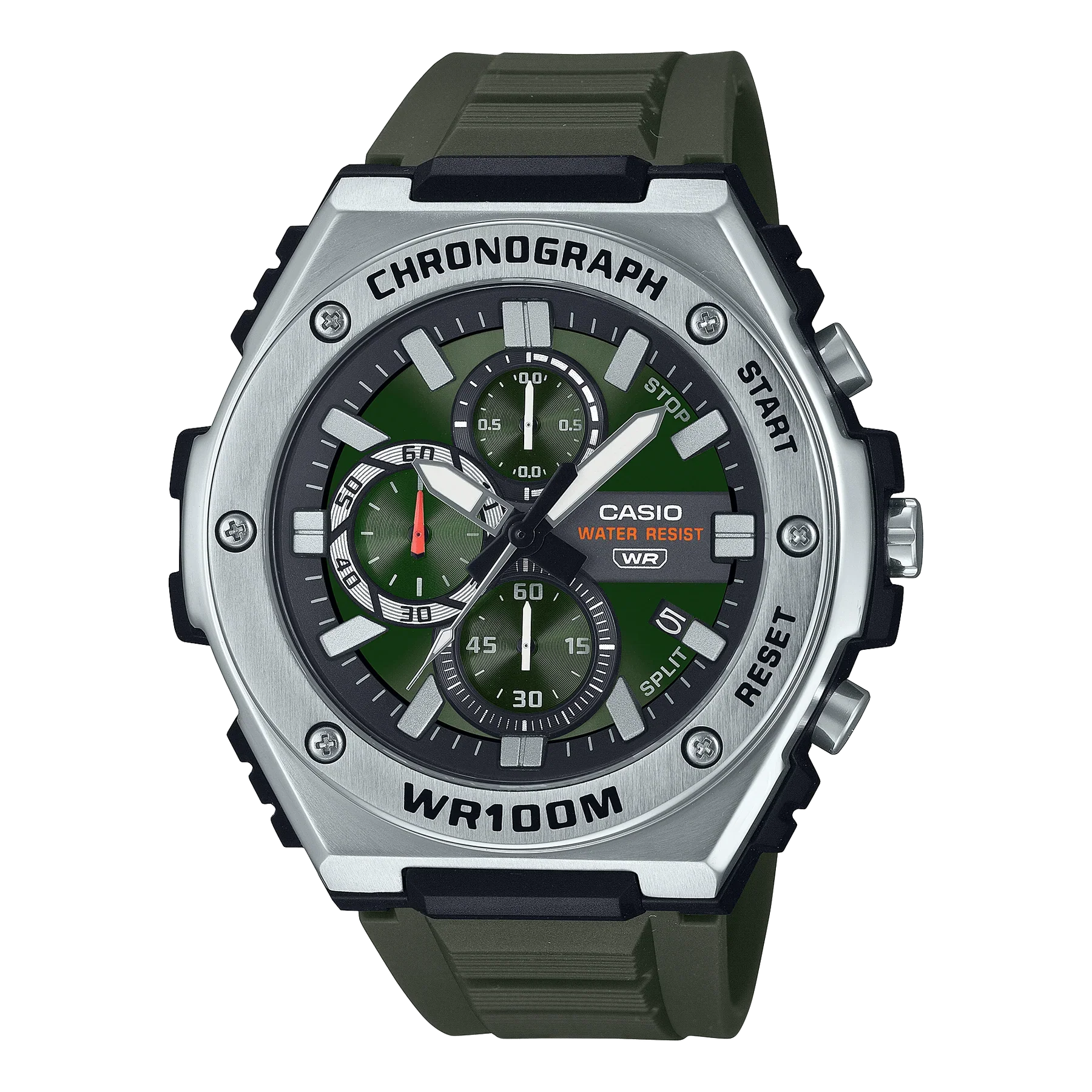 Introducing a whole new style of chronograph — a multi-dial analogue watch in a bold yet sporty metal design. The hairline and mirror finishes on the metal bezel give this timepiece a striking and sophisticated textural appeal, and casual sporty touches like the raised indexes and inset dials and subtle sunray dial close the deal. As much function as design, water resistance up to 100 meters, stopwatch, and more deliver what you need on your most active days.