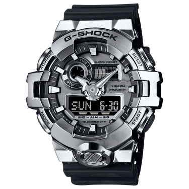 Inheriting the solid, fashionable stainless-steel bezel design of the GM-5600, GM-6900, and GM-110, the GM-700 is based on the GA-700, taking it into all-new terrain with a metal bezel in one of three different colours. The silver and gold colour bezels highlight the natural bold look of the metals they project. The striking look of the purple-black bezel is achieved with purple accents against black ion plating.