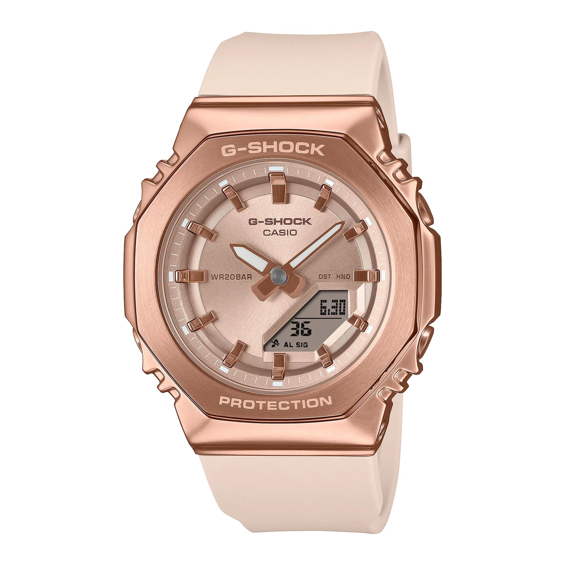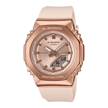Strong, steely, stylish — Go metal-clad, now in radiant shades of elegant colour. The octagonal GMS2110 takes on three new colour schemes — pink gold and black, pink gold and pink beige, and dark grey. Metal elements in the dial add shine and texture, while the compact size ensures a comfortable fit for slimmer wrists. The sophisticated, minimalist design beautifully complements whatever you’re wearing, from stylish fashion to casual cool. Key resin components in the band are made with bio-based resin produced from renewable organic resources, a material expected to help reduce environmental impact.