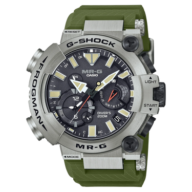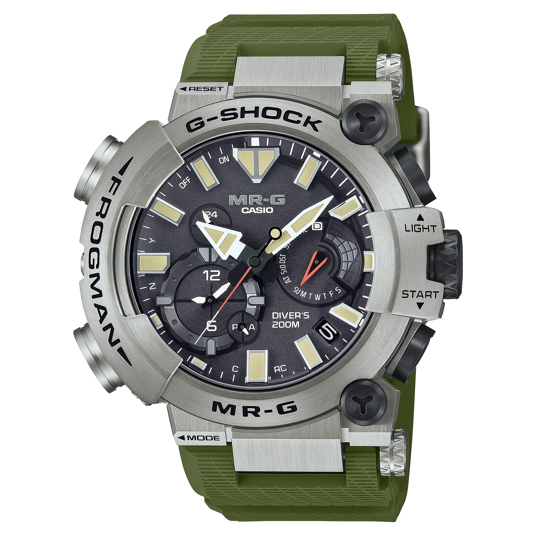 Clad in a titanium exterior, the complex asymmetrical design of this timepiece is made up of separately crafted and meticulously polished components to bring luxe MR-G quality to the FROGMAN line. Built with an intricate combination of over 70 exterior components, the case includes an O-ring waterproof seal that delivers outstanding FROGMAN water resistance as well as special buffers to strengthen the shock-resistant structure.