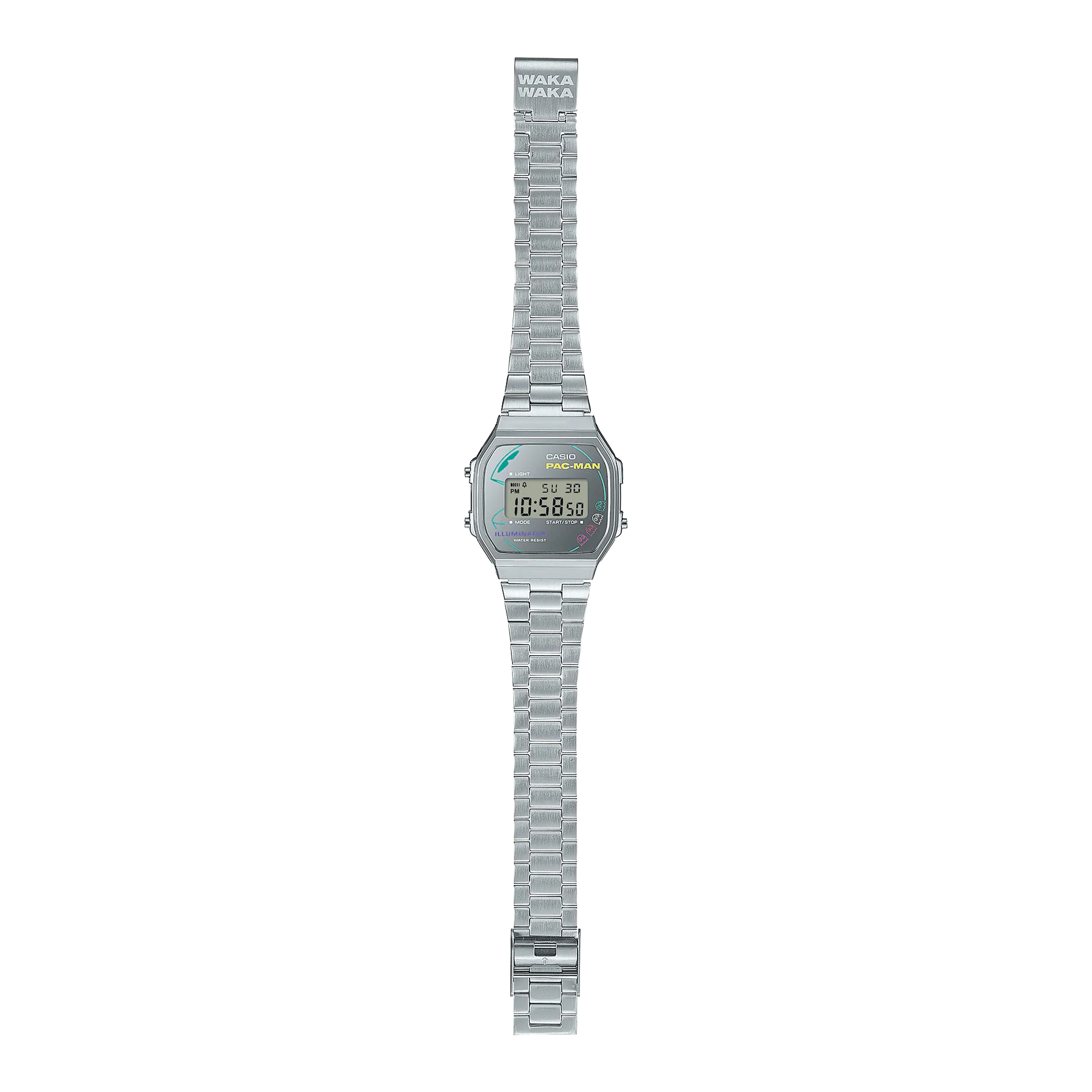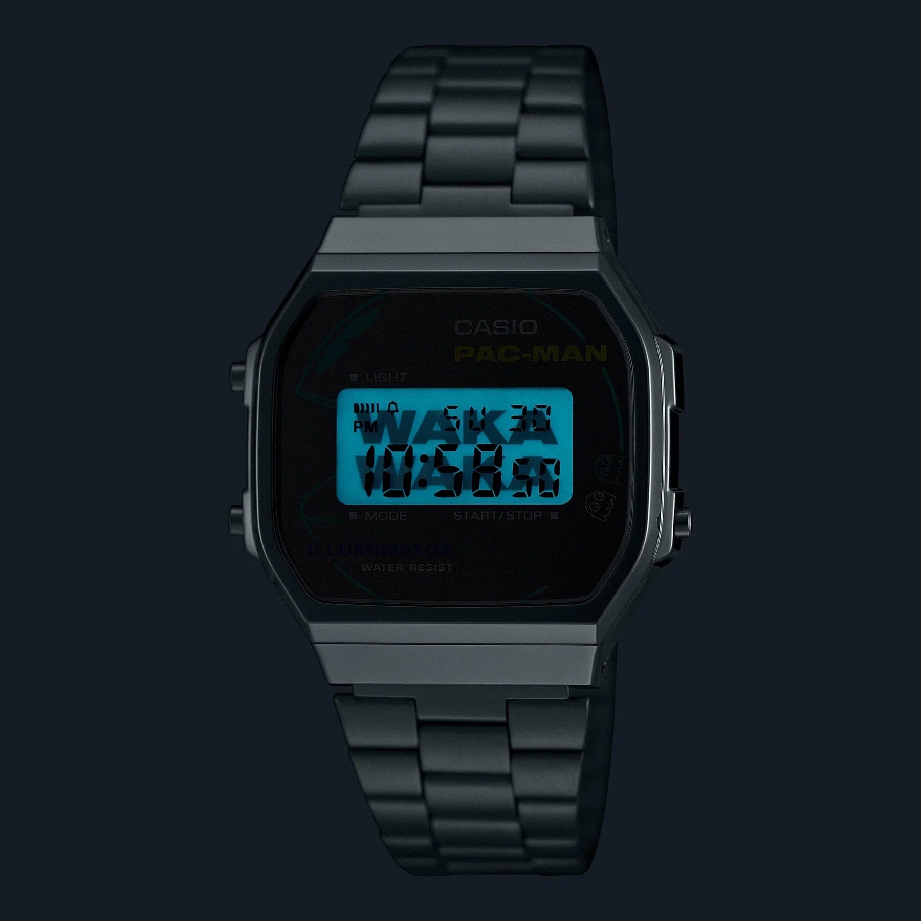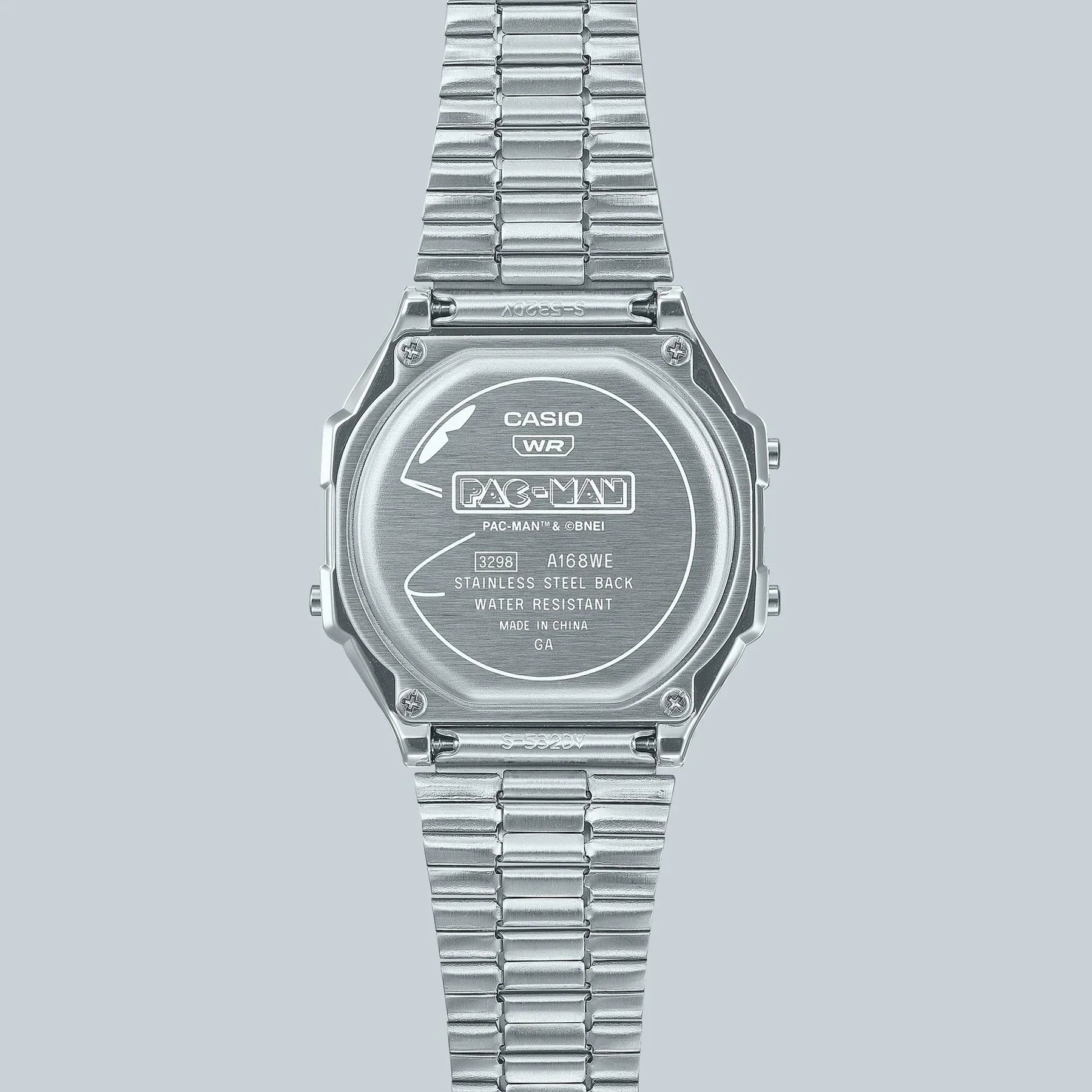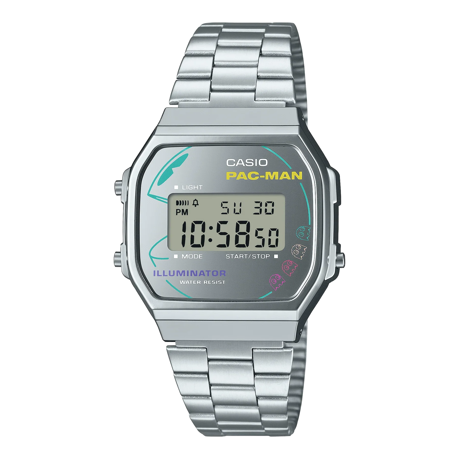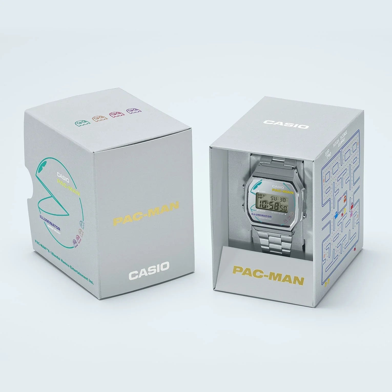 Presenting a whole collection of special collaborations to celebrate 50 years of CASIO watches and get you ready for 45th PAC-MAN anniversary in 2025. With playful designs and a nostalgic touch, this lineup brings to life the world of PAC-MAN, the ever-popular game from Namco Bandai Entertainment. A silver vapour-deposited dial, bold face layout featuring PAC-MAN and the four GHOSTS (Blinky, Pinky, Inky, and Clyde ), and a palette of vivid neon colours give the design a pop feel. “WAKA WAKA” — the sound of PAC-MAN eating cookies — is spelled out on the clasp cover and LCD (when illuminated) for an extra playful touch. The case back is also engraved with the PAC-MAN character and logo. Comes in special packaging with a neon design.