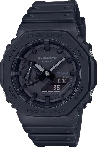 Ever since the first DW-5000C went on sale back in 1983, G-SHOCK has continued to push the limits of timekeeping toughness while creating new and original designs. These new models embody these efforts in an attractively thin configuration. These new models inherit the octagon form that was also employed for the original DW-5000C. Analog-digital timekeeping comes packed into a no-nonsense simple design without sacrificing G-SHOCK level toughness. High-strength resin material, which is reinforced with carbon fibers, makes it possible to create a case that is a mere 11.8 mm thin, which is the thinnest among G-SHOCK combination models. A new carbon core guard structure protects the module by enclosing it in a carbon case. The case is made of fine resin embedded with carbon fibers for outstanding strength and crack resistance.